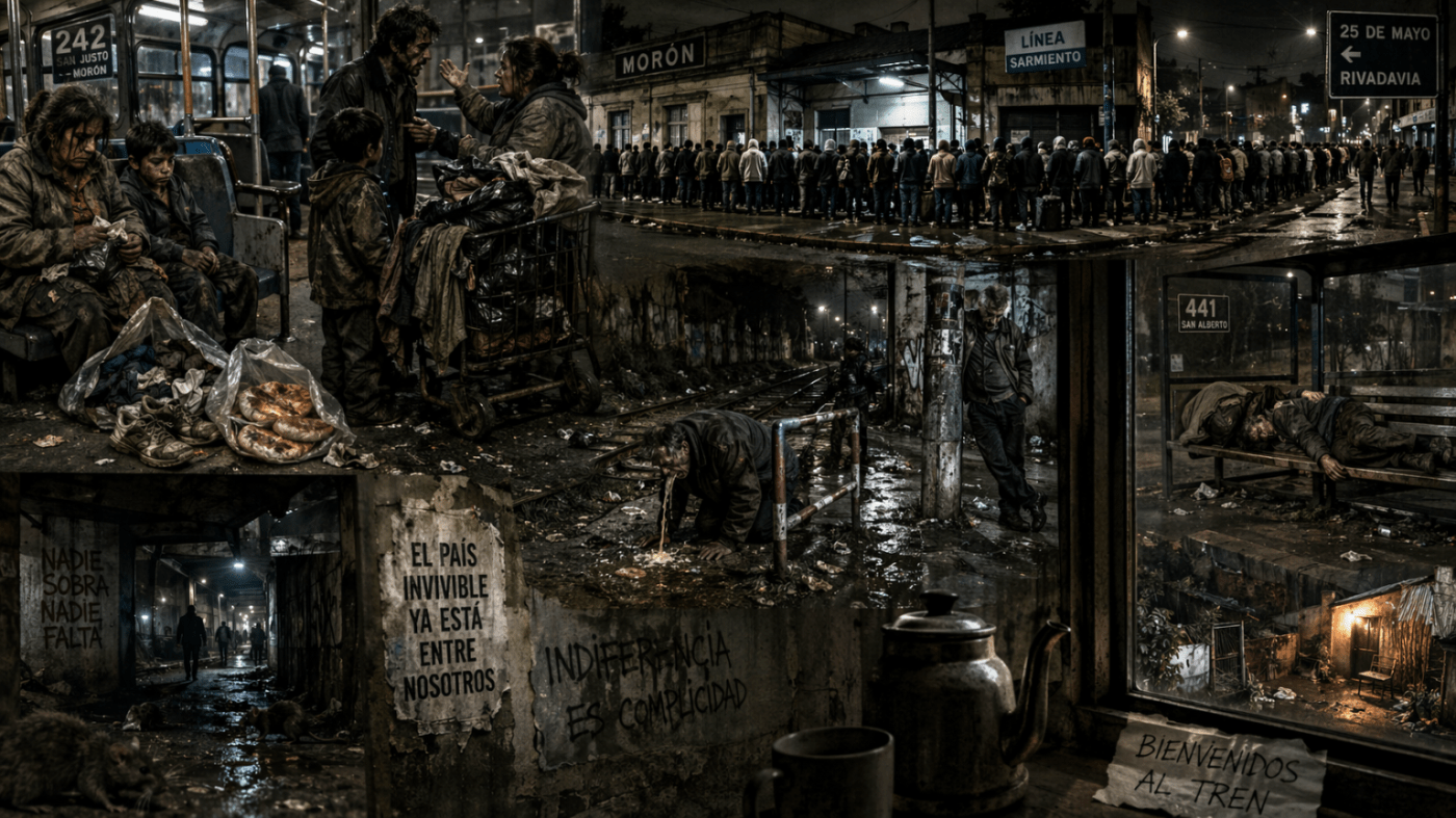 Simultáneamente, mis ojos dan testimonio como cada fin de semana al arribar a la habitual fealdad de la mencionada plazoleta frente a la estación Morón del FF.CC. Sarmiento, que decenas… qué digo decenas, cientos y hasta para ser más preciso, un largo par de centenares de seres humanos, forman desprolijas filas sobre la vereda de 25 de Mayo y doblan por avenida Rivadavia, esperando que una institución benéfica les brinde una pequeña vianda de comida, seguramente la única que comerán en todo el día, exceptuando sobras de alguna panadería o algún tacho de basura del cual satisfacerse, si cabe la adjetivación.